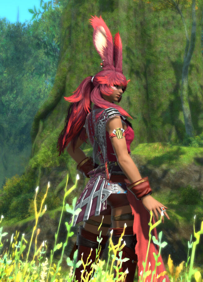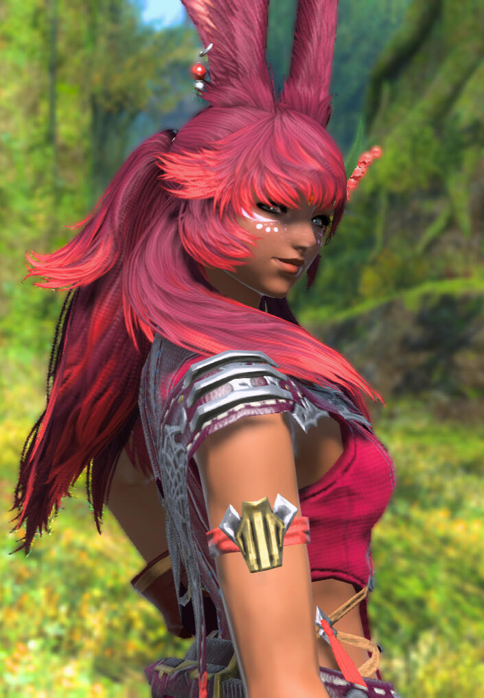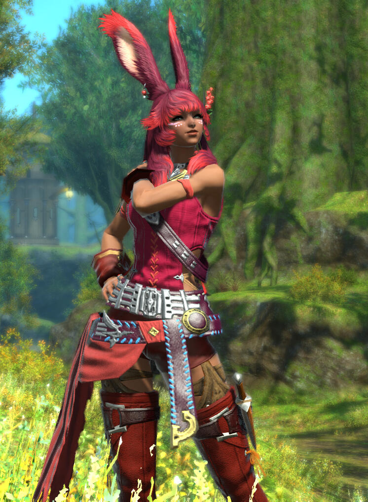 Distinguishing Features: Valflame’s Hair is never not in a Ponytail unless she’s sleeping. It was a more traditional Viera hairstyle to let the hair grow out long, but she never takes care of it and leaves it in a Ponytail.Additionally she has the Traditional markings of the Tribe under her eyes in a bright reddish-pink colour. These are accented by the cute freckles that dot her face like the night sky after a long voyage.Race: Viera of the Rava Tribe, Banished and never to return unless the world is at end. Which seems to be happening a lot as of recently. This Warrior of Light seems to be helping with that so she’s not too worried.Weapons: Chakrams/Fists - Ms. Valflame is never Unarmed for she is her weapon. Do not underestimate her or else you end up knocked out on the side of the road potentially near some Tonberrys.