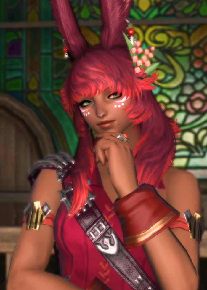 Height: Standing pretty at 6.3 Fulms, 6.9 with her ears, Say’ri towers above the average humes and her sibling Viera in arms.Build: She has a Rock Climber’s Build, slender yet can carry twice her weight. Also due to her DNC/MNK training, she’s quick as the winds.Hair: Long Burgundy hair in a Shag with Fringe and a ponytail in the back. She has bright Fiery Red highlights towards the tips of her hair.Eyes: She has Droopy Hooded Eyes, that have a beautiful Emerald Glean3 sizes: “None of your business, Sweetheart.~”Common Accessories: Say'ri is rarely seen without a freshly picked flower in her hair. The type of flower varies depending on where she's travelling at the time, but they're all usually red and pink to match her hair.