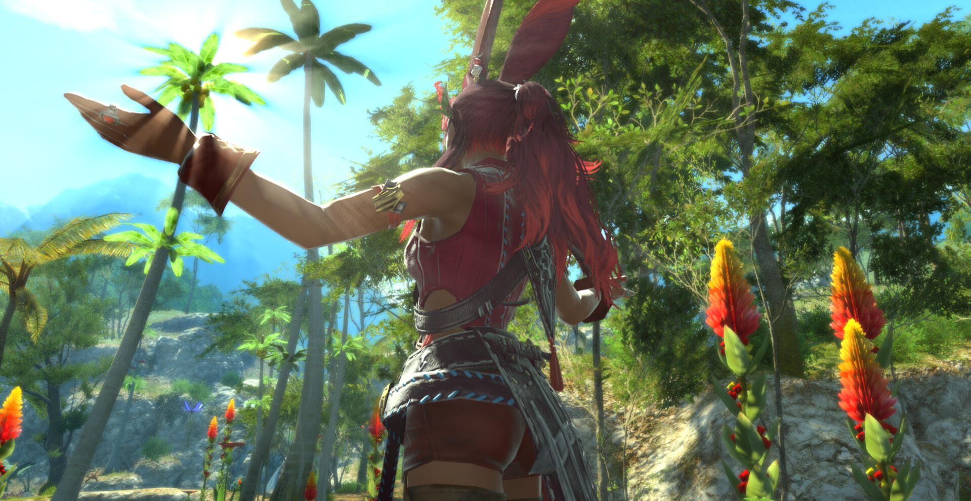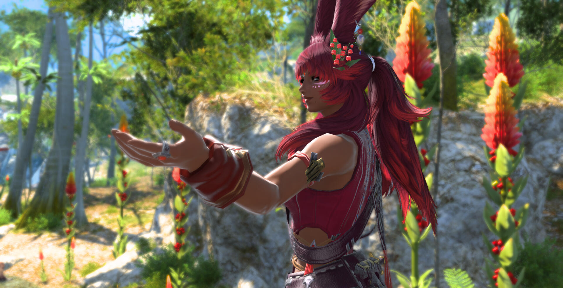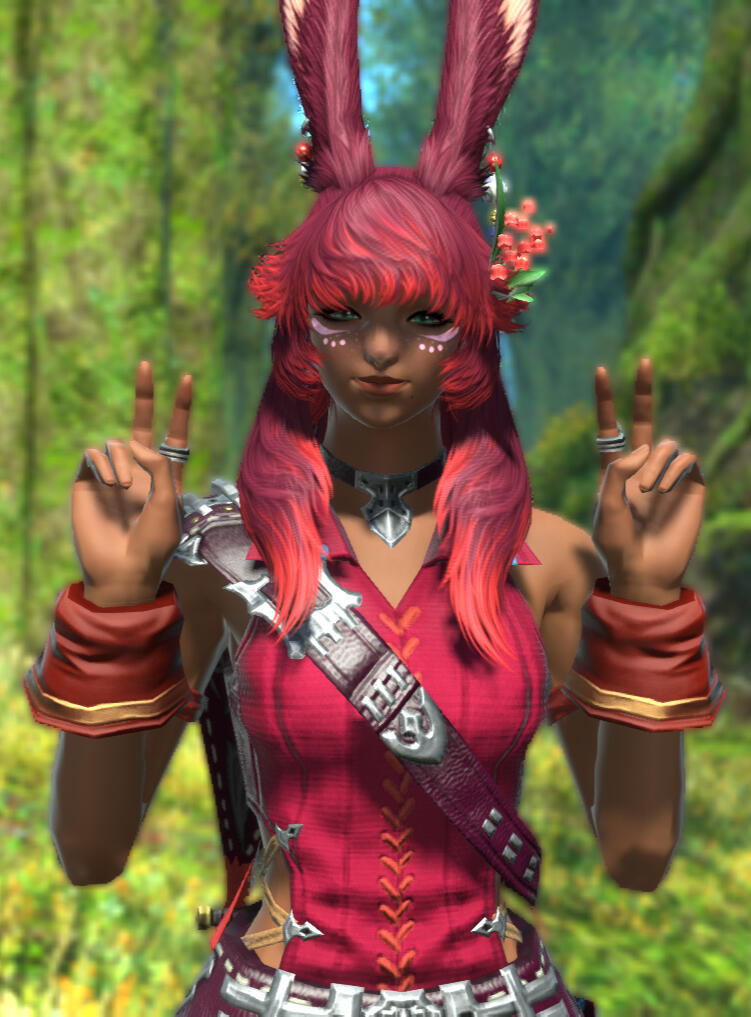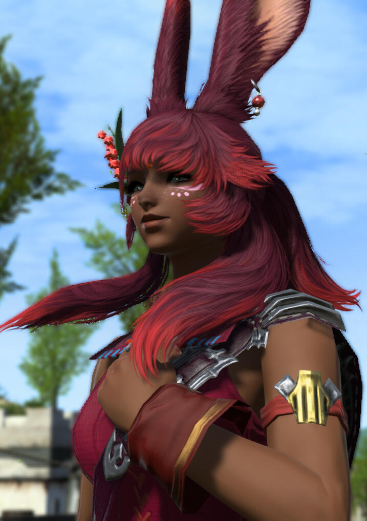 Height: Standing pretty at 6.3 Fulms, 6.9 with her ears, Say’ri towers above the average humes and her sibling Viera in arms.Build: She has a Rock Climber’s Build, slender yet can carry twice her weight. Also due to her DNC/MNK training, she’s quick as the winds.Hair: Long Burgundy hair in a Shag with Fringe and a ponytail in the back. She has bright Fiery Red highlights towards the tips of her hair.Eyes: She has Droopy Hooded Eyes, that have a beautiful Emerald Glean3 sizes: “None of your business, Sweetheart.~”Common Accessories: Say'ri is rarely seen without a freshly picked flower in her hair. The type of flower varies depending on where she's travelling at the time, but they're all usually red and pink to match her hair.